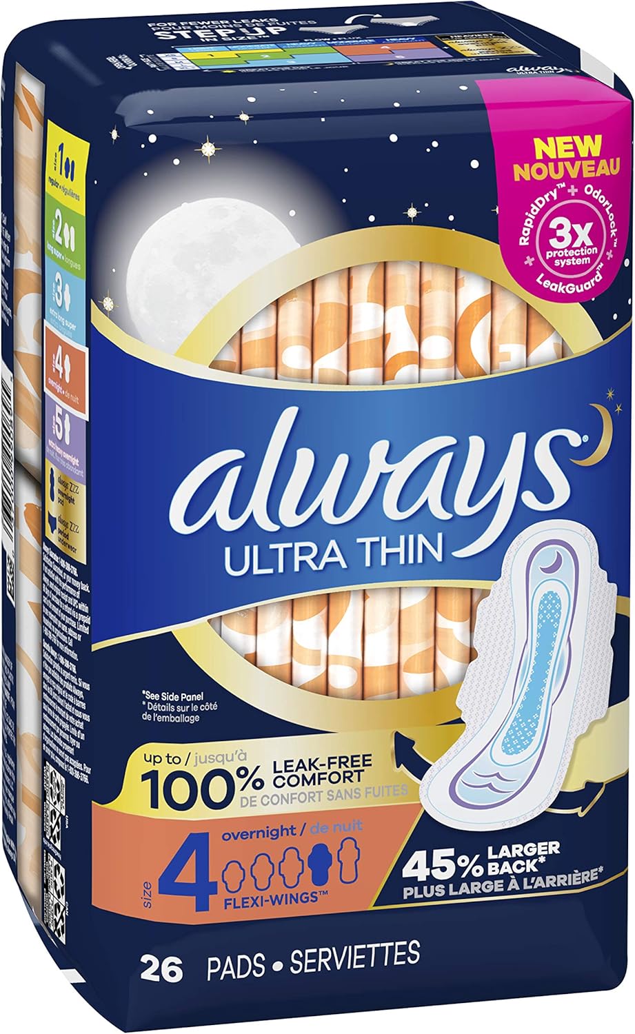 Always Ultra Thin Pads for Women, Size 4 Overnight Absorbency, Unscented with Wings, 26 Count