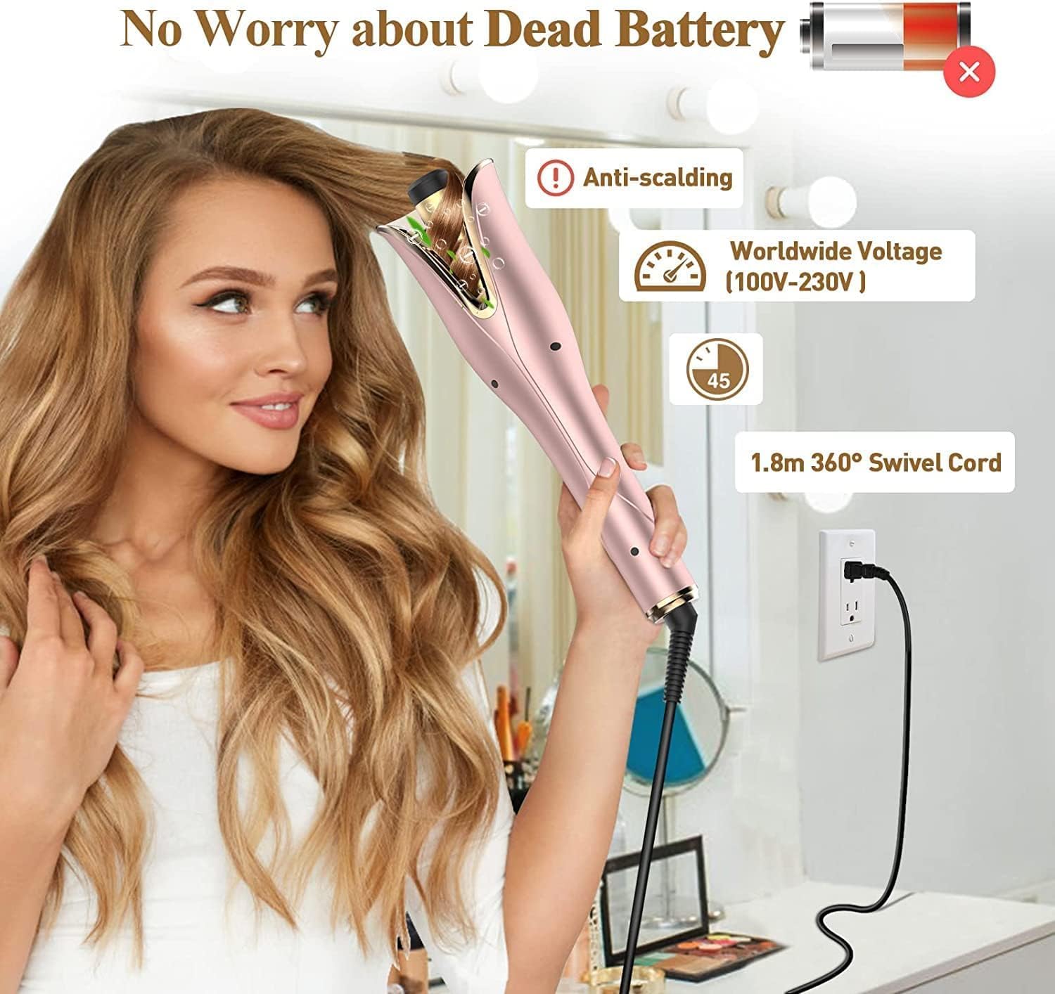 NO WORRY ABOUT DEAD BATTERY: No need to worry about running out of battery to maintain full curls, as it have a 1.8m 360° swivel power cord. This hair curler will automatically shut off if no operation is detected for 45 mins